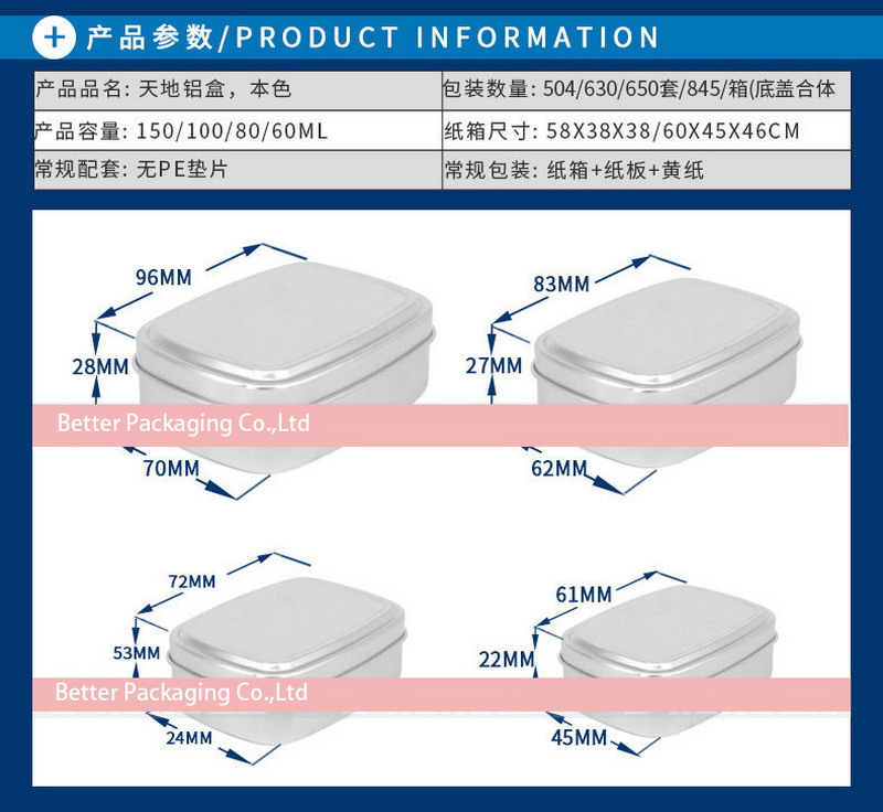 Specification item value Industrial Use Food Other Food Place of Origin Better Packaging Recyclable Metal Type TINPLATE Logo/graphic design Custom Logo With Screen Printing, UV, Labels, Etc Material Fabric, Metal, Paper, Silk, Stainless Steel, Steel, TIN, TINPLATE, Wood, aluminium, iron, plastic, zinc alloy, Other Plastic Type PA Material Structure Tinplate Lid+Body Paper Type Paperboard Wood Type Plywood Printing Handling UV coating Custom Order Accept Brand Name OEM/ODM Model Number 12*9*4cm